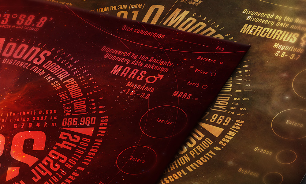 Some infographic poster about our Solar System's planets. To place the planet's data in a ring like way was the first concept. But then it builded a complete infographic poster for each planet.